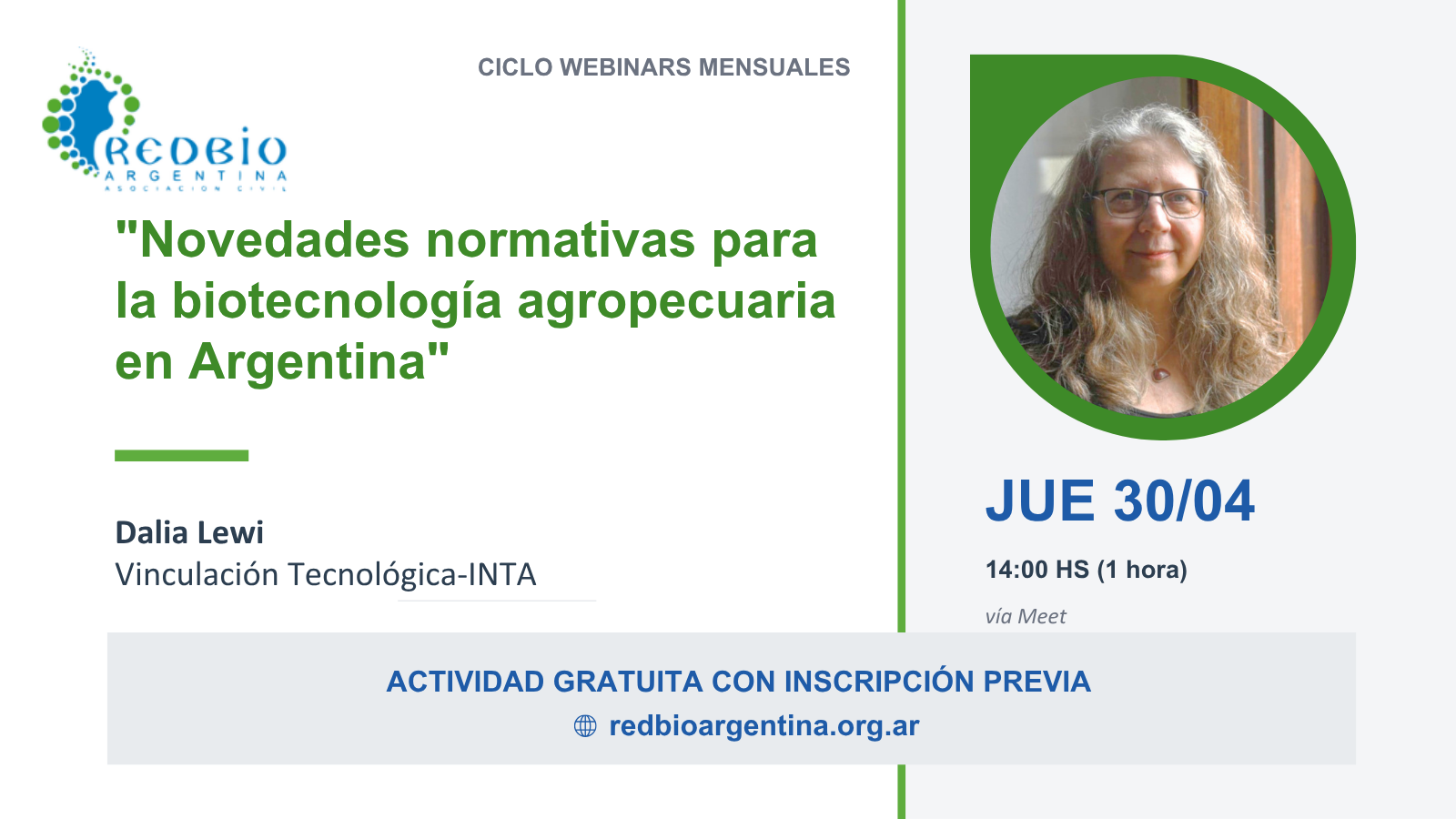 “Novedades normativas para la biotecnología agropecuaria en Argentina” Disertante: Dalia Lewi Fecha: Jueves 30 de abril de 2026 · 14:00 h (hora Argentina) Modalidad: Virtual, vía Google Meet Actividad gratuita con inscripción previa.