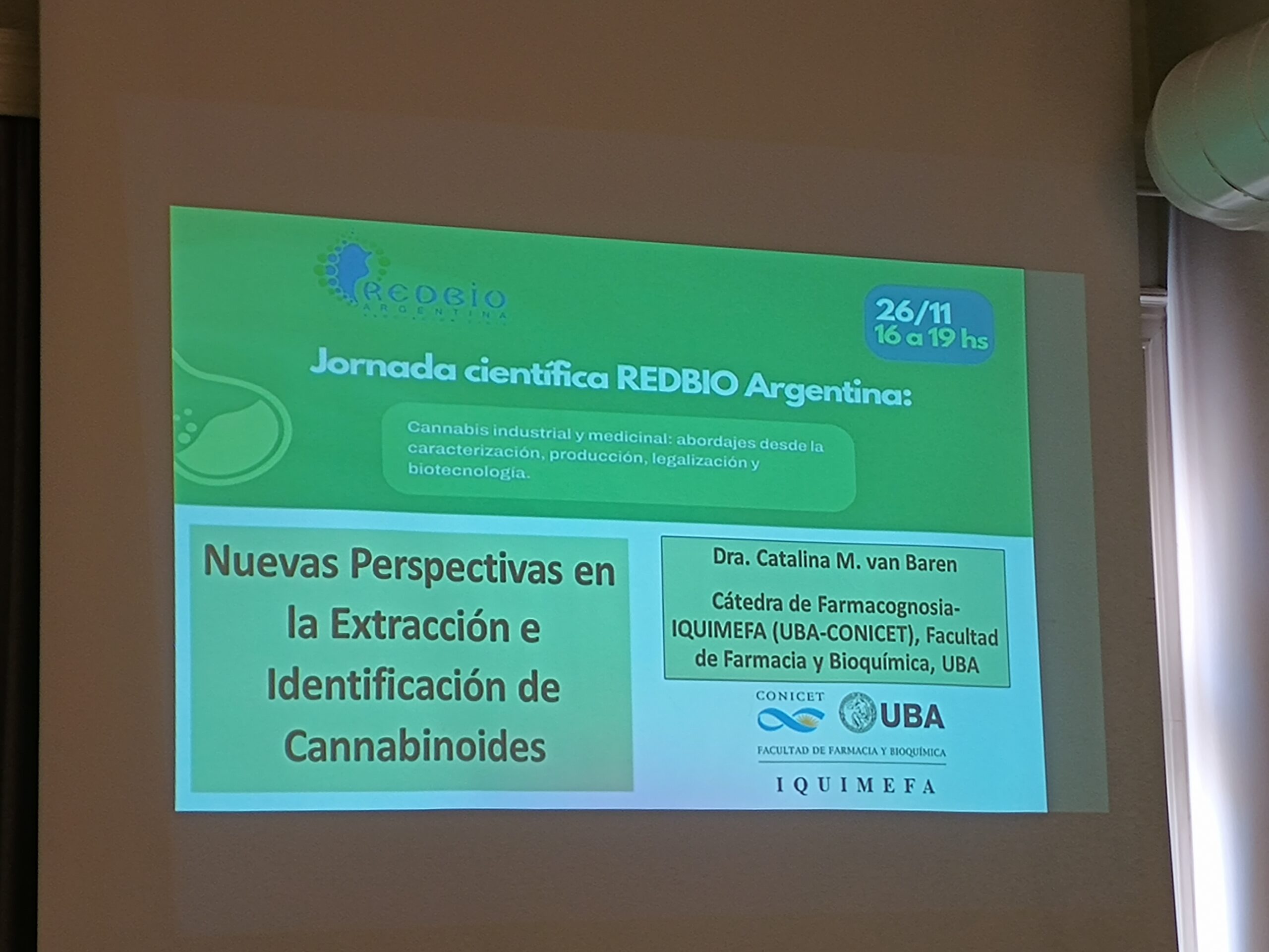 | 16:35 | Catalina Van Baren | Cátedra de Farmacognosia-IQUIMEFA (UBA-CONICET) | “Nuevas perspectivas en la extracción e identificación de cannabinoides”. |